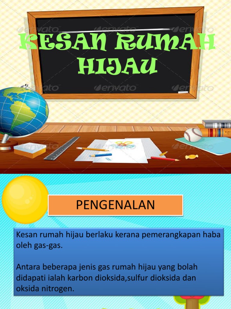 Sebahagian dari tenaga ini akan terarah kepada permukaan lalu memanaskannya. Kesan rumah hijau MAKSUD KESAN RUMAH HIJAU Kesan rumah hijau adalah fenomena penigkatan suhu atmosfera bumiIni disebabkan oleh haba yang diserap dan terperangkap di dalam atmosfera bumi oleh gas tertentugas rumah hijauseperti klorofluorokarbon karbon dioksidametana PUNCA. Kesan rumah hijau ialah pemanasan yang berlaku apabila kepekatan gas-gas rumah hijau di dalam sesuatu ruang tertutup meningkat dan menyekat haba daripada mudah terbebas.